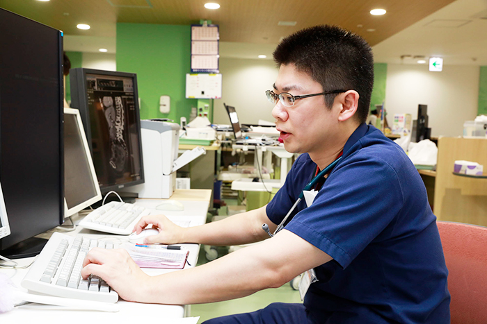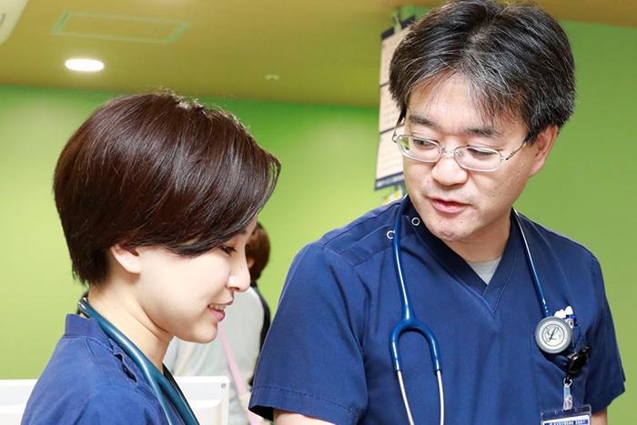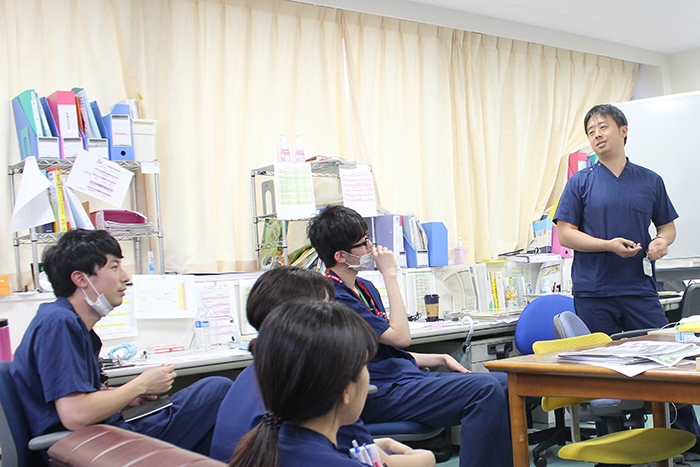 明るく勉強熱心な研修医が毎年集まるので、教えがいがあるし私の方が学ぶことも多いんですよ。研修目標は、患者さんの立場に立ち診断・治療を行う「主治医能力」が持てるようになること。普段は研修医一人一人の個性や到達度に応じ、丁寧に教えることを心掛けています。病院としての「研修における医療行為安全基準ガイドライン」も明確なので、研修医には安心して患者さんに向き合ってもらいたいと思っています。